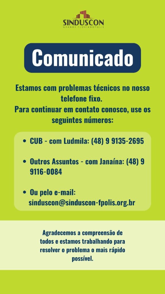 Para continuar em contato conosco utilize o e-mail: sinduscon@sinduscon-fpolis.org.br, ou os seguintes números: